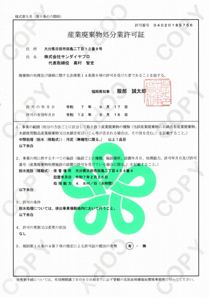 大分県許可に続き福岡県産廃処分業取得しました 2025 10/02 お知らせ 2025年9月30日2025年10月2日 大分県許可に続き、福岡県の産業廃棄物処分業許可も取得いたしました。 大分県内、福岡県での、カッター汚泥処分、マニフェスト回付が可能です。 現在、熊本県の許可も申請中です。 ぜひご依頼ください。 お知らせ